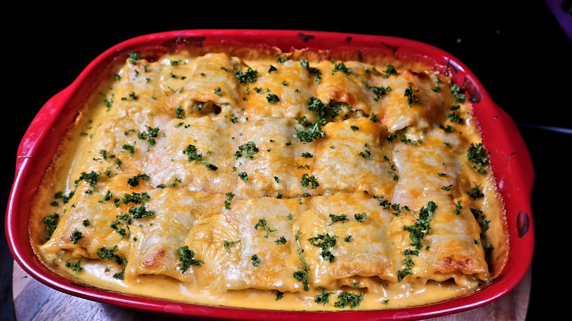 Lay out the cooked lasagna noodles and spoon the mixture evenly on top of the noodles. Gently roll up and place in the prepared pan.