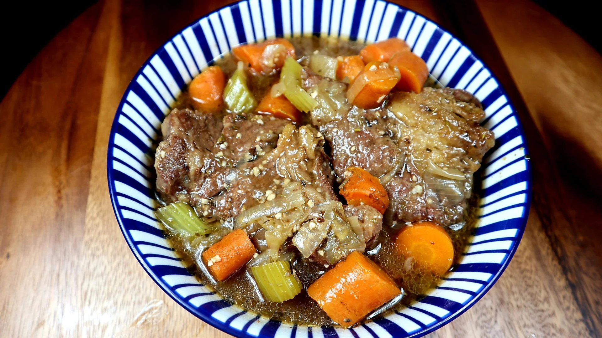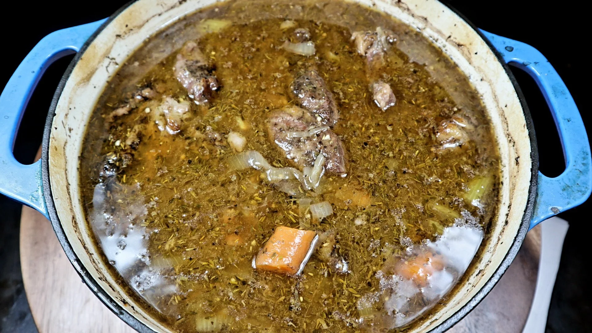 Add roast to pot and the remaining beef broth along with the wine, thyme, rosemary and bay leaves. Season with salt and pepper and bake in the oven for about 2.5-3 hours. (You may add potatoes if you like. If you do, remove roast after 1.5 hours, add the peeled and sliced potatoes to the top of the pot and cook for an additional 1.5-2 hours till potatoes or cooked through.)