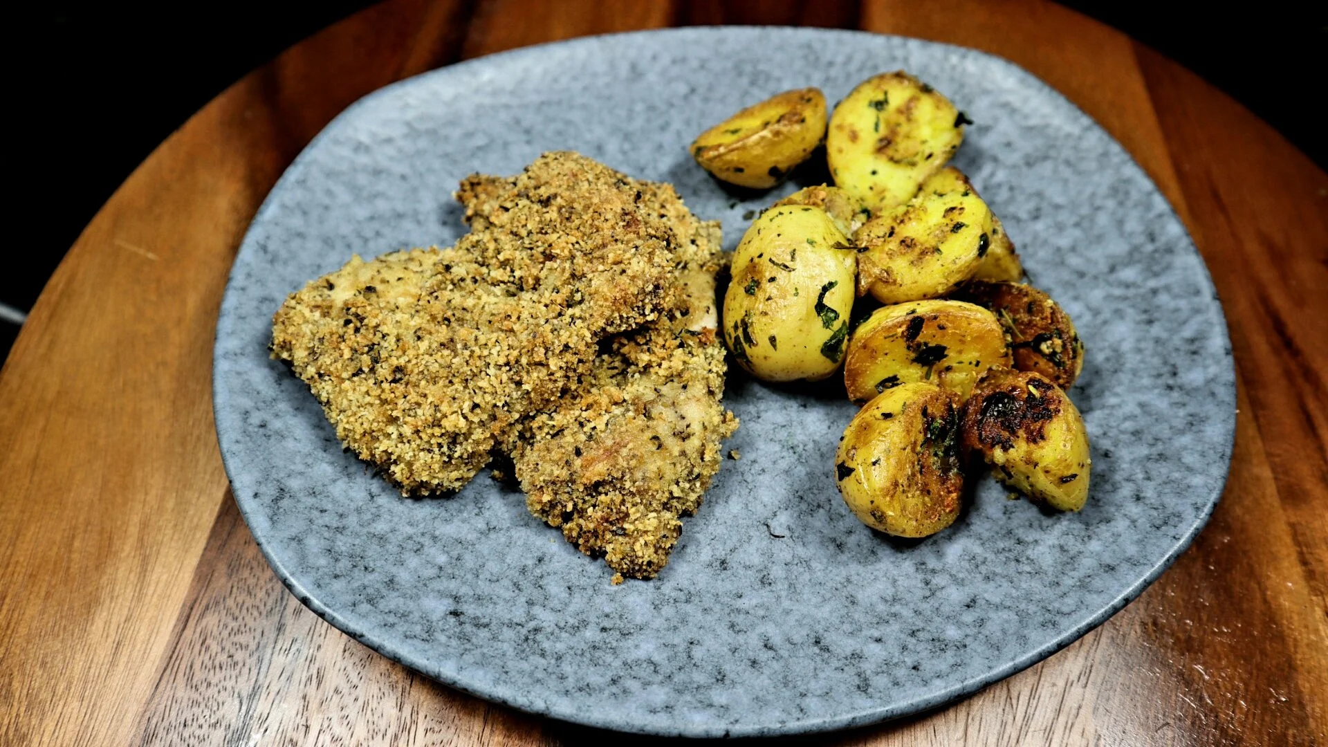 Dip each chicken in the oil, then dip in the breadcrumb mixture and press it down on each side, then place on/in your baking unit. Sprinkle any leftover breadcrumb mixture on top of the chicken.